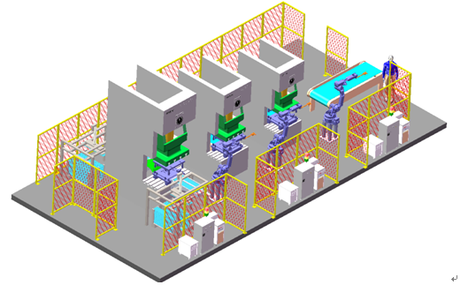 (5) 整个冲压过程,机器人只对工件进行下料和上料,便完成所有冲压工序。