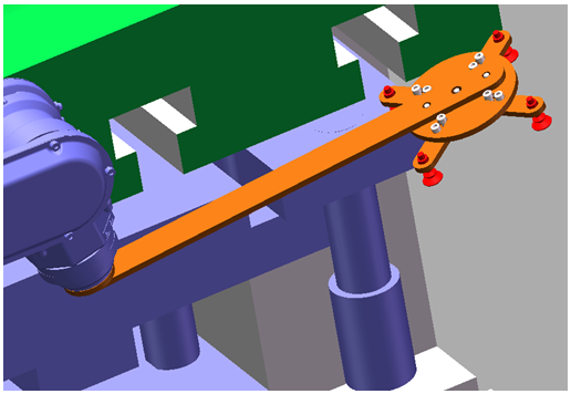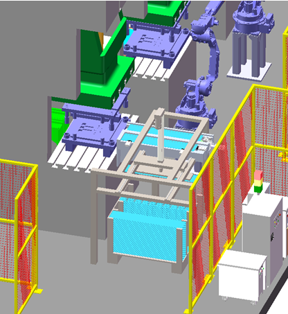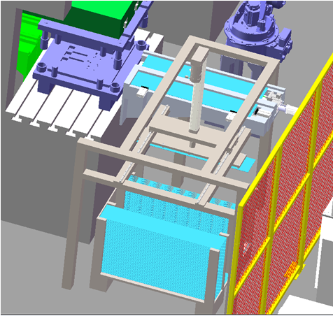 冲压机床完成冲压后,机器人得到系统响应信号,按要求使用抓手抓取工件。在冲压连线过程中,六轴机器人只需在冲压模具内抓取工件,即可将半成品送入下一个冲压模具内。如下图所示: