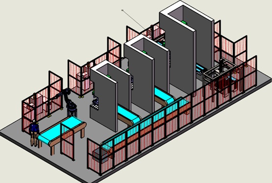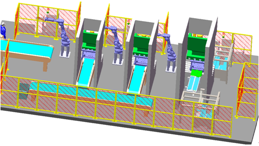 此系统为工业机器人冲压连线系统。本系统选用三台六轴工业机器人、配套机器人搬运夹手等专业设备,采用流水线对工件进行下料和上料,以完成冲压产品的整个冲压过程。