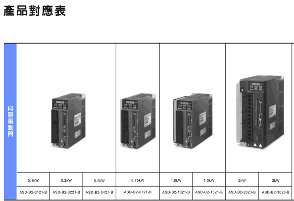 ASDA-B2系列功率數由0.1kW到3kW,其優越的性能特點強調於「內建泛用機能應用,減少機電整合之變異成本」。使用台達ASDA-B2系列產品時,除了可便利完成配線和操作設定,在與他牌產品更換過程中,馬達尺寸的對應性和產品特性的匹配,皆在水準之上。ASDA-B2系列不僅滿足市場對於泛用產機的國產化設備需求,並且針對專用機提供多樣化的操作選擇。